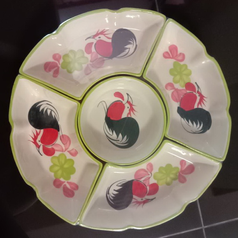 ชุดถาดเซรามิคแบบหมุนได้ 12 นิ้ว ประกอบกันเป็นทรงกลม ชุดออเดิร์ฟงานผลิตราคาส่ง สำหรับใช้งานเอนกประสงค์ ใส่อาหารได้หลายเมนู งานเคลือบใสเพ้นท์ลายตราไก่และลายดอก